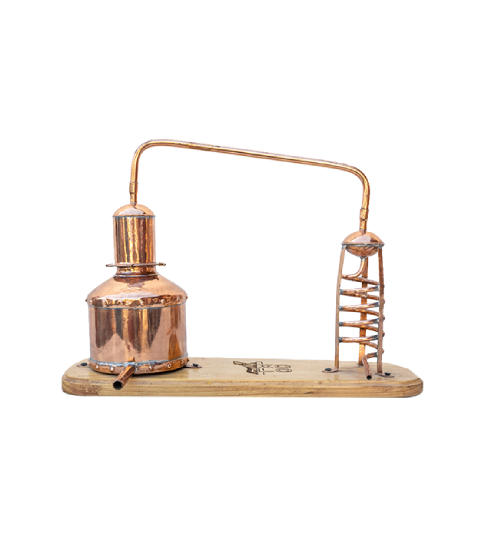 Destilador (alambique artesanal) de cobre laminado para la destilación de mezcal con capacidad de 300 litros, fabricado en cobre laminado de primera, soldado. Dicho destilador consiste en una olla base de cobre calibre 10, forjado a mano, cuerpo cilíndrico calibre 14, rolado con costura soldada. Medidas: 80 cm de diámetro x 60 cm de alto.