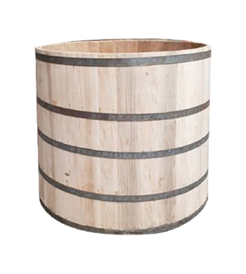 Hechas con madera estufada con, cuerpo y fondo con duelas de tablón de 4 cm de espesor, cepilladas y ajustadas para garantizar sellado y evitar fugas, las duelas del cuerpo están amarradas con tres abrazaderas o cinturones de solera de acero. Dimensiones generales: 1.18 m de diámetro superior x 1.28 m de diametro inferior y 0.90 m de alto, color madera natural.